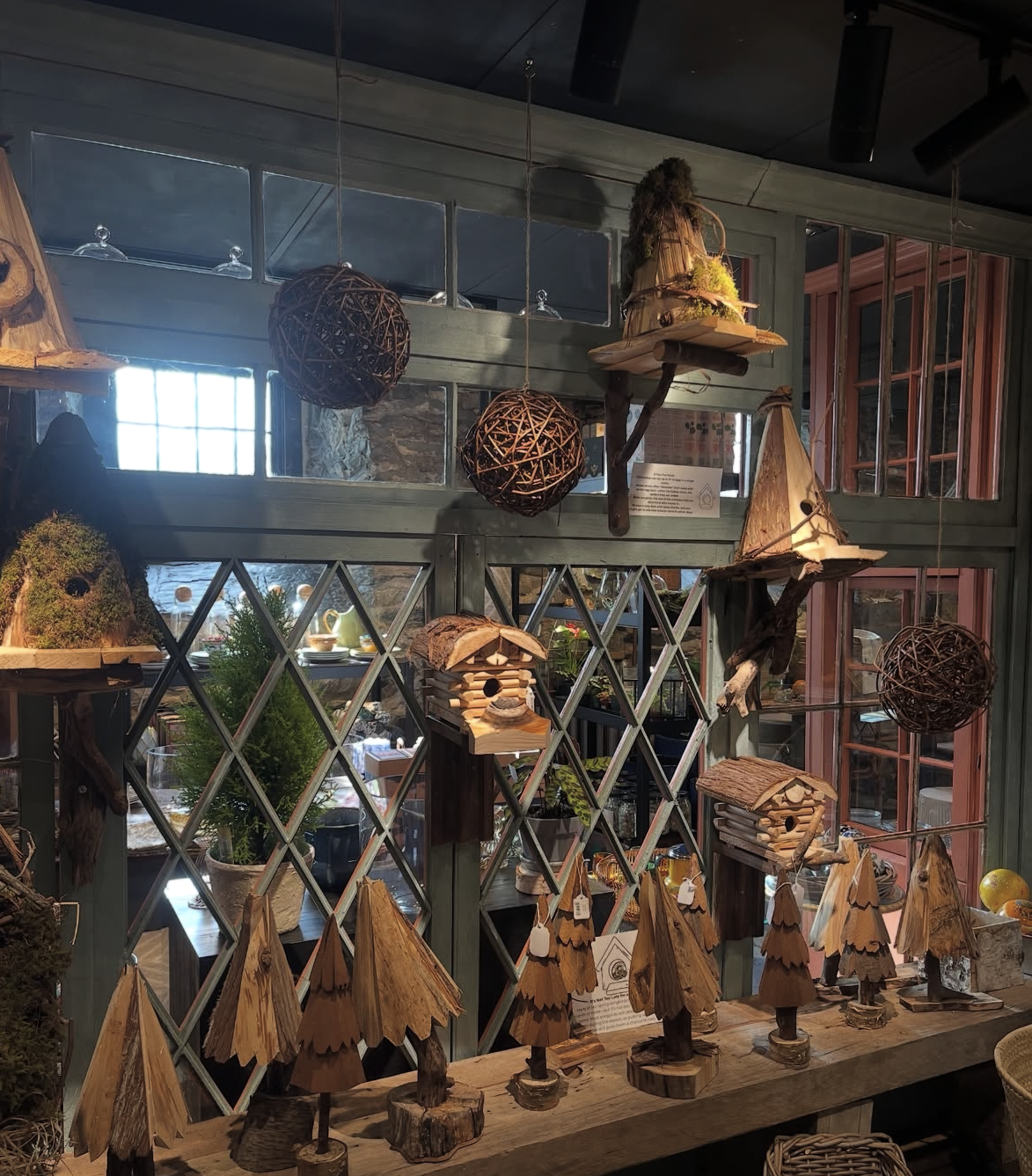 Decorative wooden birdhouses and hanging woven balls displayed inside a rustic store.