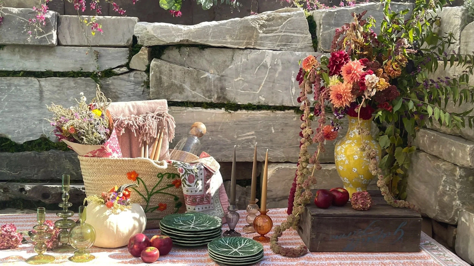 Decorative table setting with flower vases, plates, candles, and apples against a stone wall background.