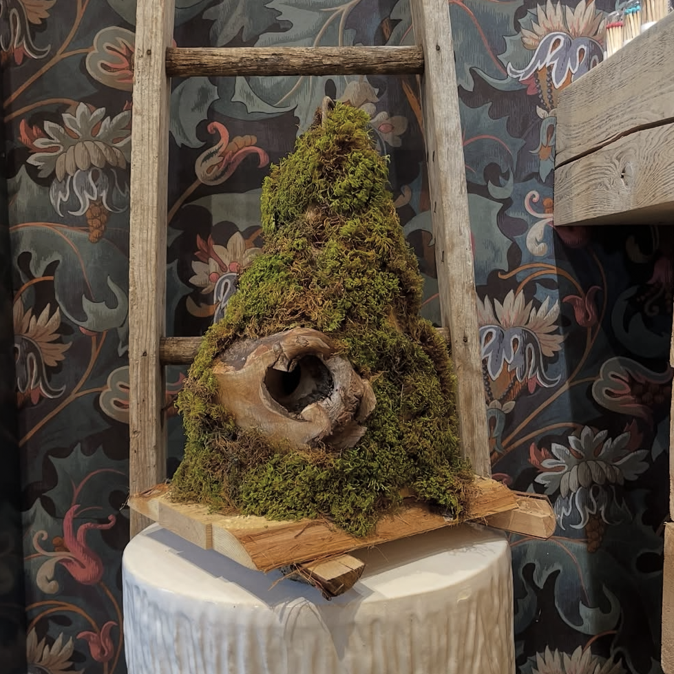 A moss-covered wooden sculpture with a hollow opening, placed on a wooden base on top of a white, textured pedestal, with a colorful floral patterned wallpaper background.