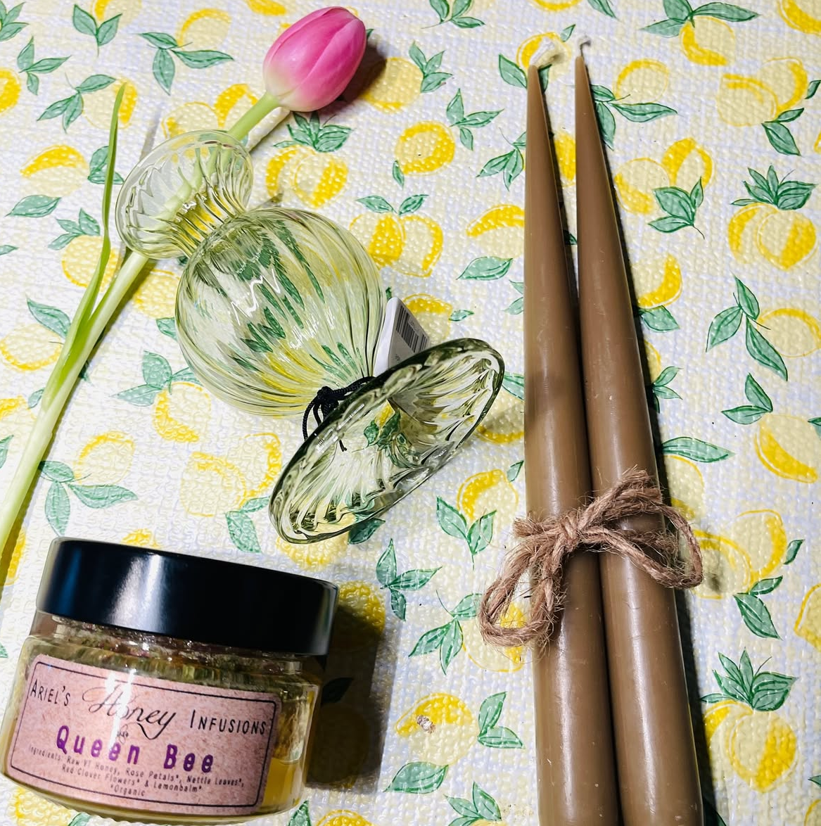 A pink tulip flower, two glass perfume bottles, a black-capped jar labeled 'Queen Bee' honey infusions, and two brown taper candles tied with a piece of twine, all arranged on a lemon-patterned tablecloth.