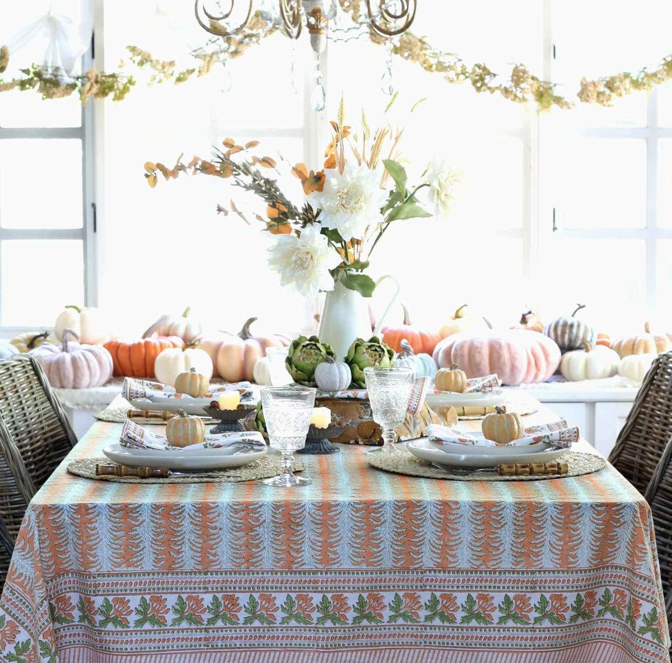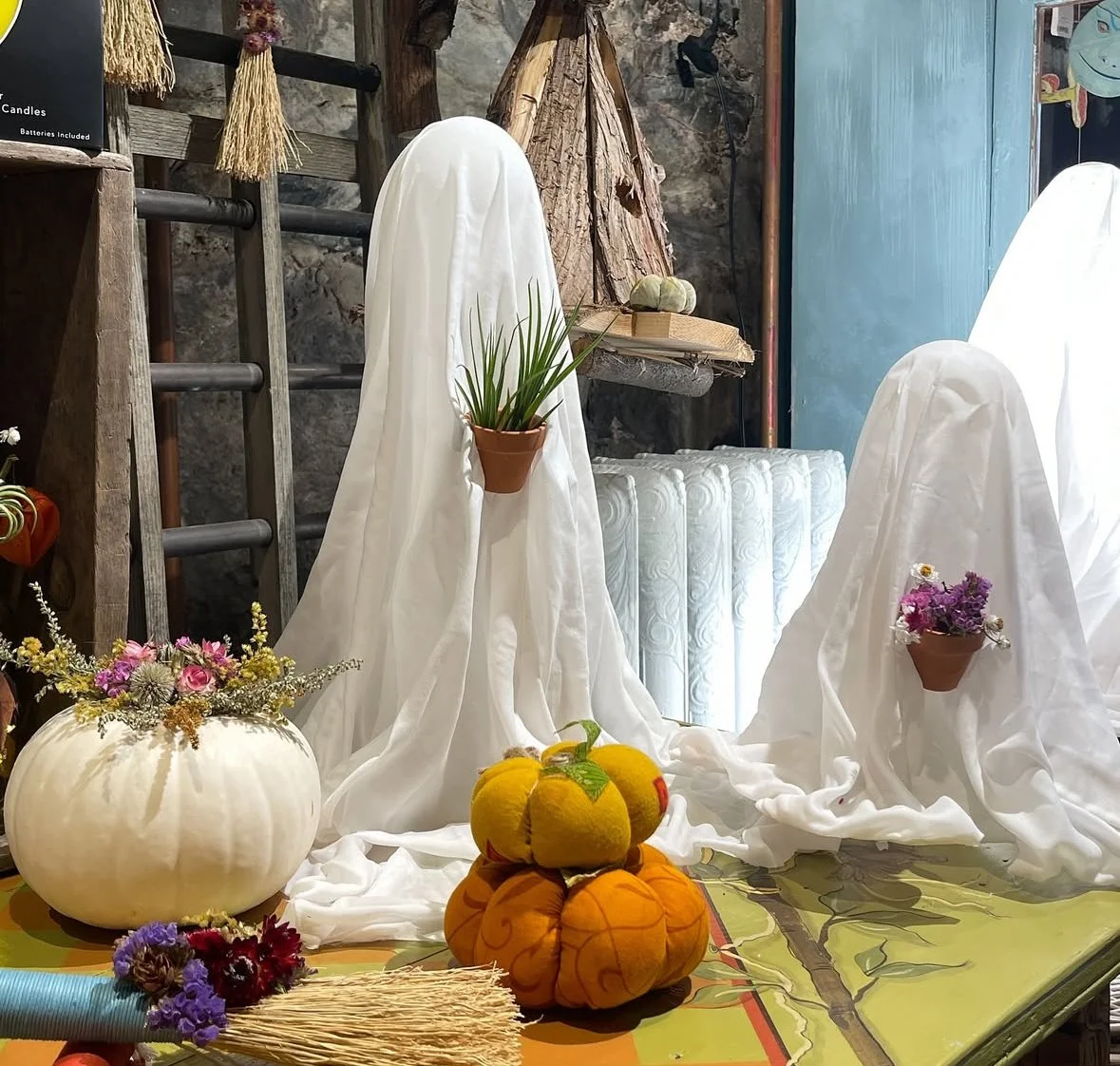 A display of autumn-themed decor with white cloth draped over objects, potted plants, and fabric pumpkins, set against rustic wooden and stone background.