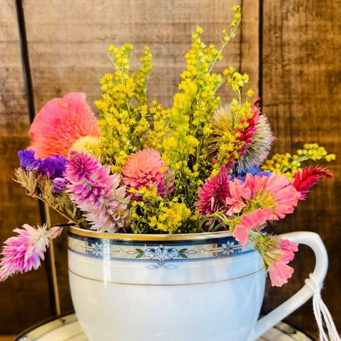A white teacup-shaped planter with a floral pattern, filled with colorful dried flowers including pink, purple, yellow, and red, set against a wooden background.